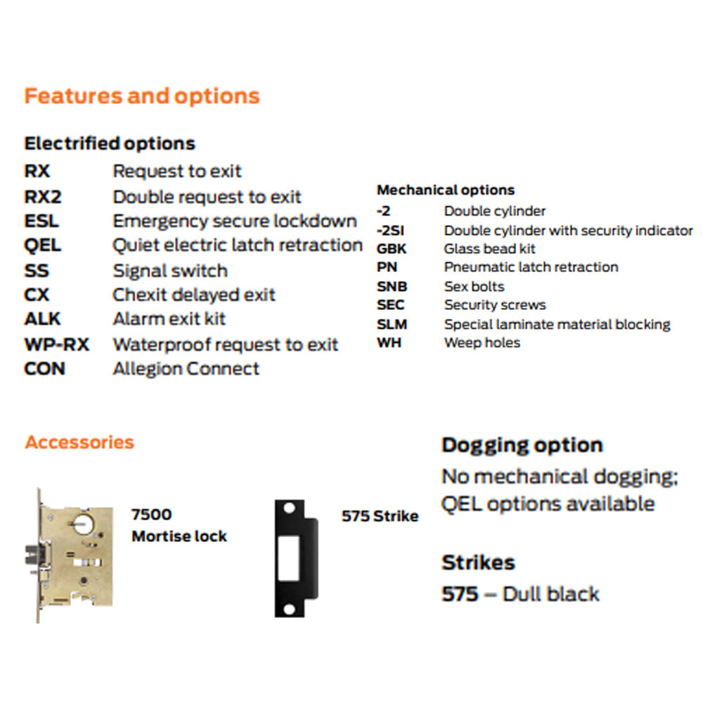 - -2/-2SI: Double cylinder (-2) or double cylinder with security indicator (-2SI), allows users to lock the outside trim from inside the room, while still allowing free egress.