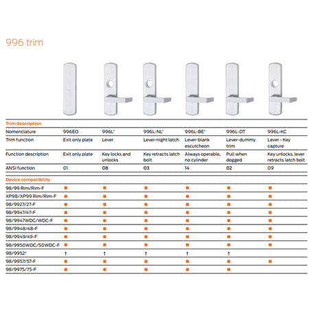 Von Duprin 996L-NL-M - Lever, Night Latch Trim for Mortise Lock 98/99 Series Exit Devices
